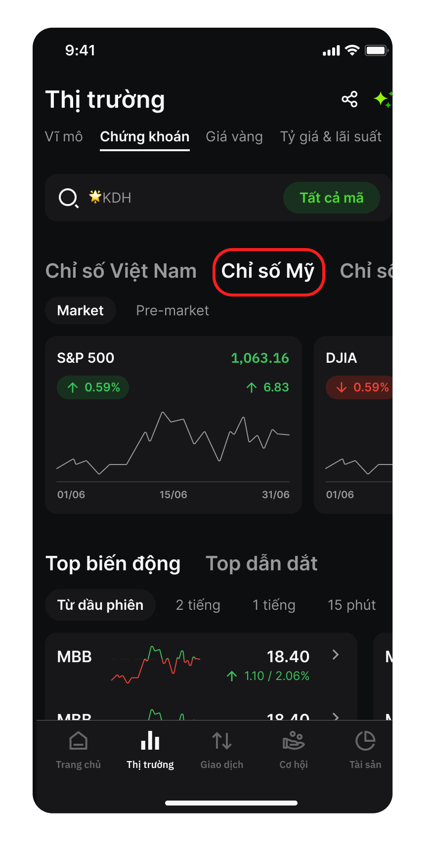 Tại màn Thị trường > Chọn Chỉ số Mỹ, Chỉ số Châu Á.